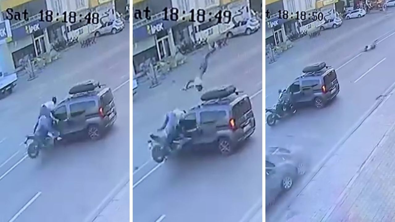 Elazığ'da bir motosiklet, yola çıkan hafif ticari araca çarptı. Meydana gelen kazada motosikletteki yolcu havada 3 takla atarak yere düştü. O anlar güvenlik kamerasıyla görüntülenirken, motosikletteki iki kişinin de durumunun ağır olduğu öğrenildi.