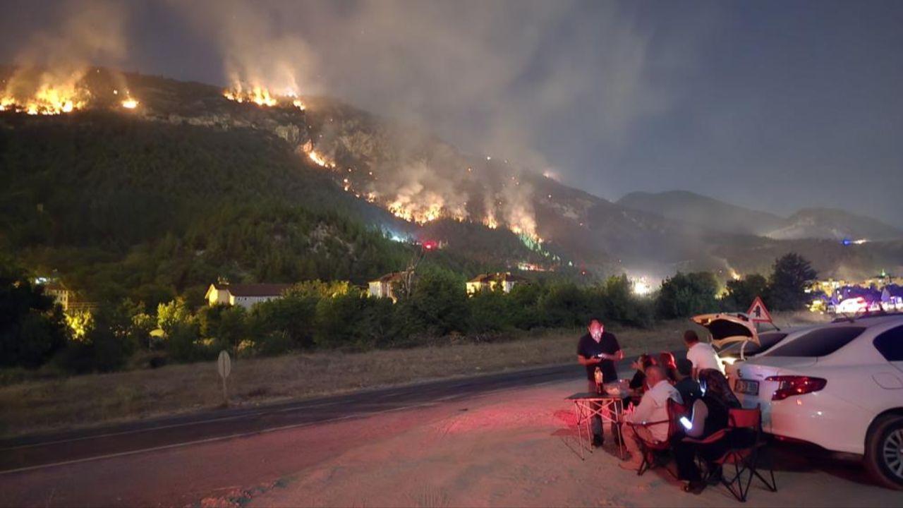 Tedbir amaçlı köyün boşaltıldığı bölgede alevler geceyi aydınlatırken, bazı vatandaşların kamp sandalyelerinde oturarak çay içip yangını izlemesi dikkat çekti.