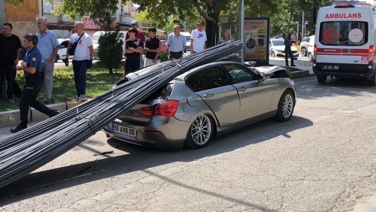 Elazığ'da inşaat demiri yüklü tırın kırmızı ışıkta ani fren yapması sonucu taşıdığı tonlarca demir, lüks bir otomobilin üzerine düştü. Facianın eşiğinden dönülen kazada 2 kişi yaralandı.