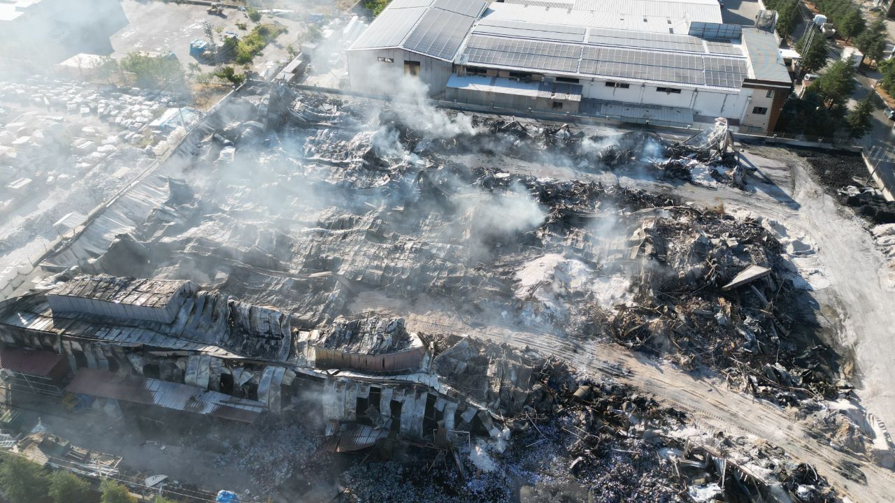 Söndürme çalışmalarının ardından fabrikada soğutma çalışmaları devam ediyor.