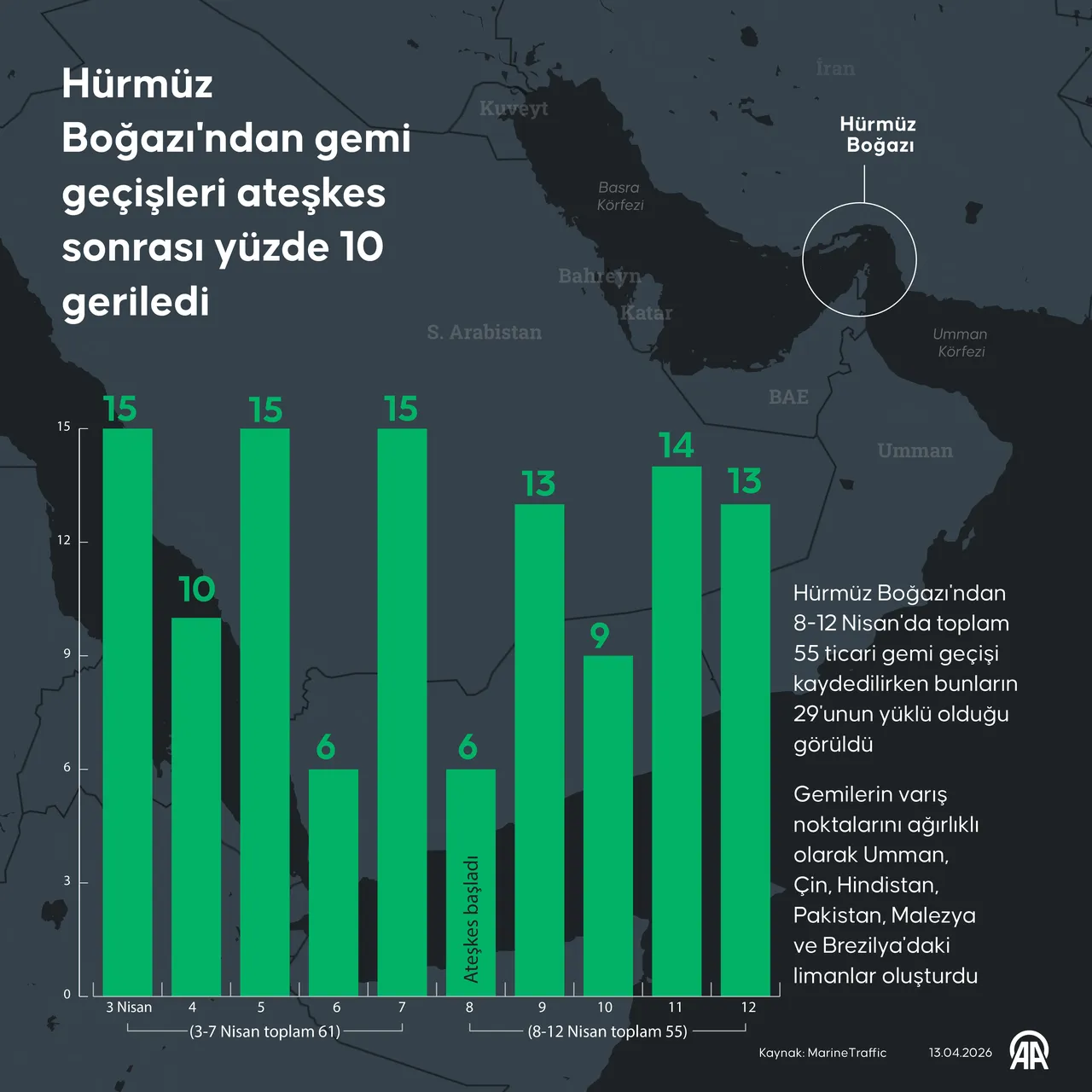 Hürmüz Boğazı'ndan ticari gemi geçişleri ABD ve İran arasında sağlanan iki haftalık geçici ateşkesin ilk 5 gününde yüzde 10 gerilerken söz konusu gemilerin varış noktalarını ağırlıklı olarak Umman, Çin, Hindistan, Pakistan, Malezya ve Brezilya'daki limanlar oluşturdu.