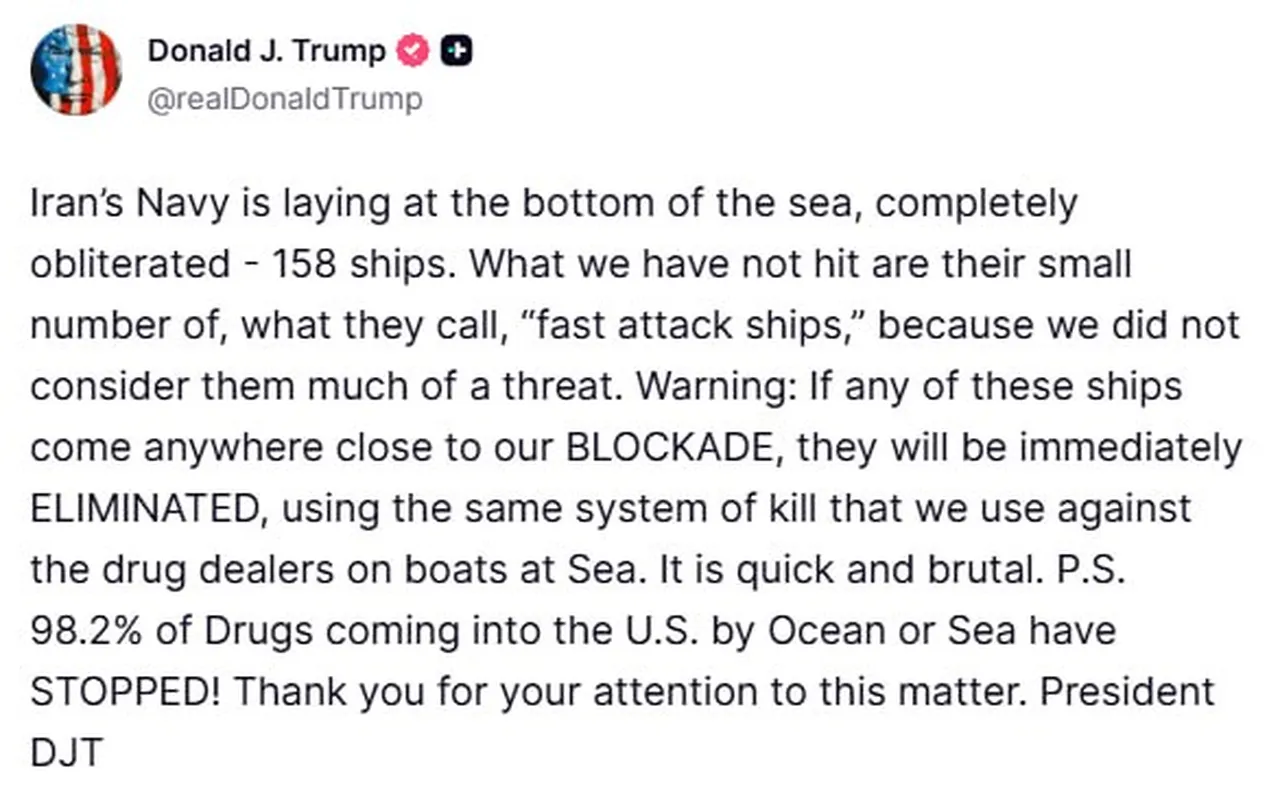 "İran’ın donanması denizin dibinde yatıyor, tamamen yok edildi — 158 gemi. Vurmadığımız şey ise onların “hızlı saldırı gemileri” dedikleri az sayıdaki küçük gemi. Çünkü bunları büyük bir tehdit olarak görmedik. Uyarıyorum. Bu gemilerden herhangi biri ablukamıza yaklaşırsa, denizde uyuşturucu kaçakçılarına karşı kullandığımız aynı yöntemle derhal imha edilecekler. Bu hızlı ve acımasızdır. Not edin. ABD’ye okyanus ya da deniz yoluyla gelen uyuşturucuların %98,2’si durduruldu. Bu konuya gösterdiğiniz ilgi için teşekkür ederim."
