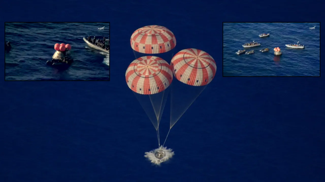 Atmosfere ses hızının 35 katı hızla giren ve 5.000 dereceyi bulan kavurucu sıcaklıkları ısı kalkanıyla bertaraf eden Orion, üç ana paraşütünün açılmasıyla okyanusa yumuşak bir iniş yaptı.