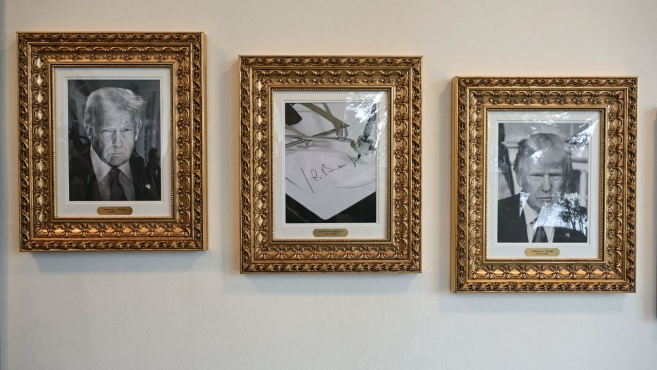 Koridor boyunca çerçeveler içerisinde sergilenen fotoğraflar arasında, Trump’ın selefi Joe Biden’ın fotoğrafı yerine “otomatik kalem” görseli yer aldı.