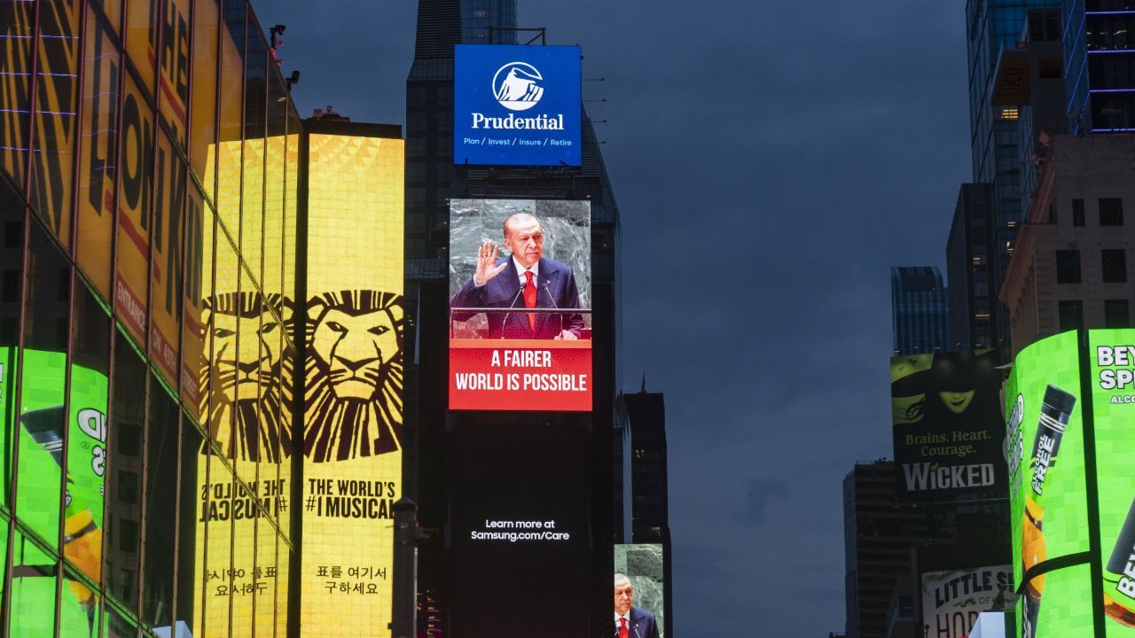 Cumhurbaşkanı Erdoğan'ın sık sık dile getirdiği "Dünya beşten büyüktür" sözü, New York'taki ünlü Times Meydanı'nda ekranlara yansıtıldı.