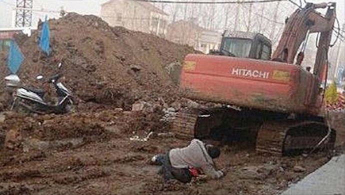 Çin'in Hubei eyaletinde meydana gelen olayda, yapılan kazıdan dolayı evinin yıkılmasından endişe eden kadın greyderin altında can verdi.