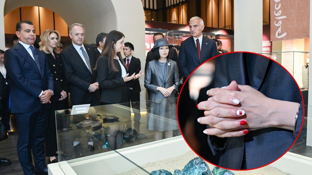 Japonya Altes Prensesi Akiko Mikasa, Ankara ziyareti kapsamında Cumhurbaşkanlığı Külliyesinde bulunan 'Arkeolojinin Altın Çağı' sergisini ve Anıtkabir'i ziyaret etti. Prenses’in parmağındaki Türk ve Japon bayraklı motifler ise ziyaret esnasında dikkat çeken detaylar arasında yer aldı.
