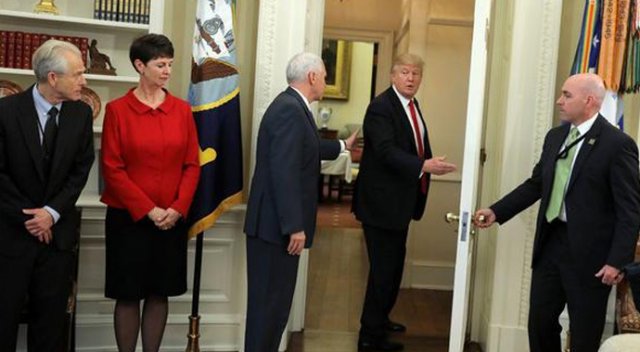 ABD Başkanı Donald Trump iki başkanlık kararnamesini imzalamak için yardımcısı Mike Pence ve diğer yetkililerle kameraların karşısına geçti. Trump, “Herkese çok teşekkür ederim. (Kararnamenin) Güçlü sonuçlarını çok çok kısa bir zamanda göreceksiniz” dedikten sonra bir anda odanın kapısına yöneldi. Yardımcısı Mike Pence, o sırada Flynn ile ilgili soru soran gazetecilere cevap vermeden odayı terk eden Trump'a imza atmadığını söylese de Trump kararnameyi imzalamadan odadan çıktı.