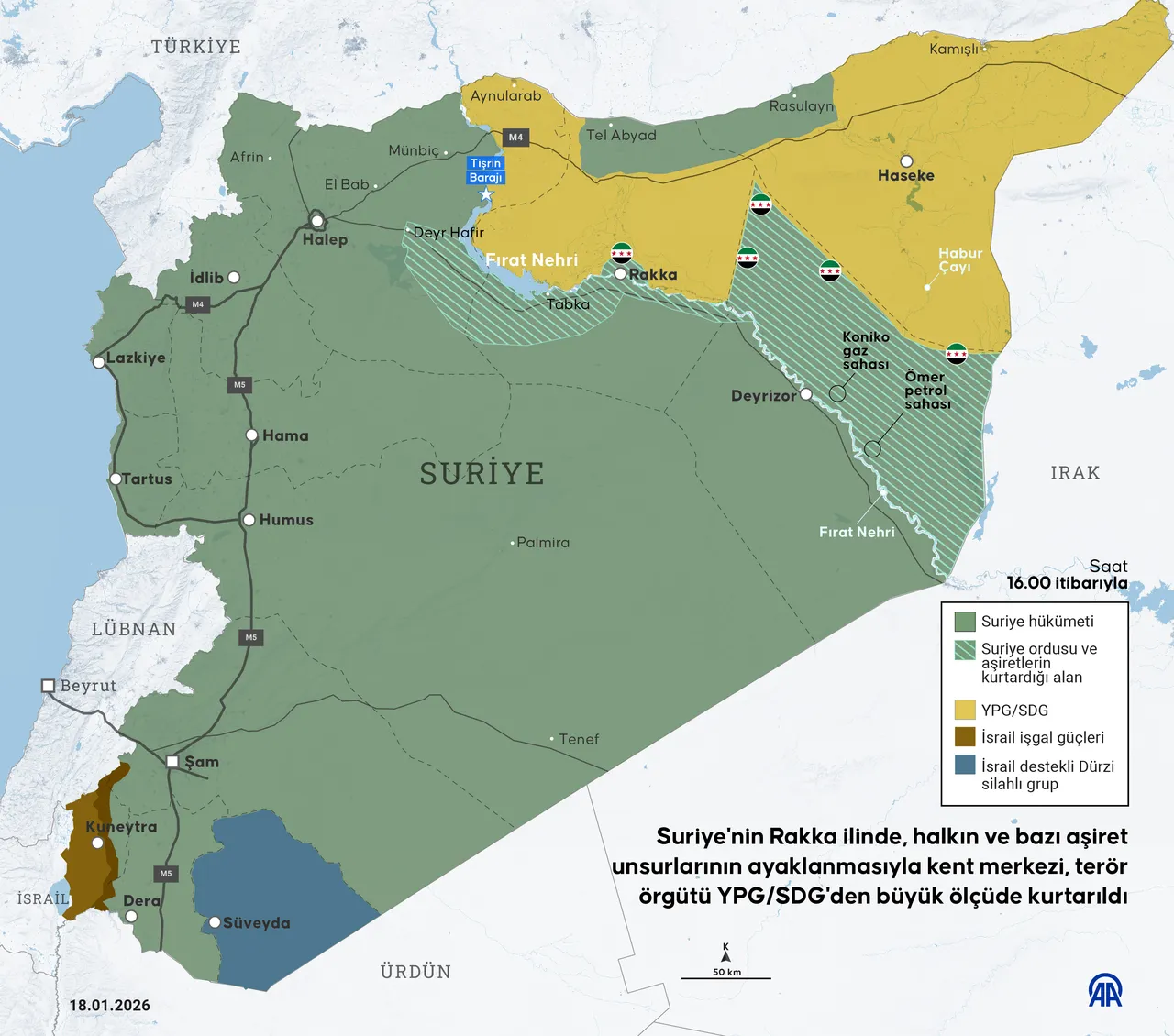 Suriye'yi bölme planları yapıp Rakka ve Kamışlı'yı üs tutan teröristler için Fırat'ın doğusu da artık güvenli değil. Sabah saatlerinde Suriye Devlet Televizyonu Rakka'nın batısındaki Baas Barajı ve Tabka Havalimanı'nda kontrolünün Suriye ordusu tarafından sağlandığını duyurdu. Şam'a bağlı güçler, Rakka'nın stratejik öneme sahip Tabka ilçesinin kontrolünü tamamen ele aldı. Suriye Ordusu'nun Rakka'ya 5 kilometre uzakta olduğu bilgisi verildi. Fırat Nehri'nin doğusundaki Deyrizor ilinde ise ayaklanan aşiretler, doğalgaz ve petrol sahalarının bulunduğu bölgeyi YPG'den kurtardı.