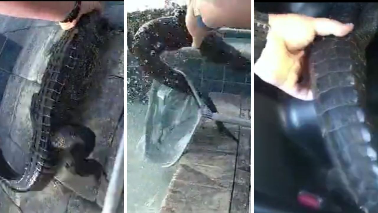 O anlar vücut kameralarına yansırken, görüntülerde polis memurunun çıplak elle sakin bir şekilde suya uzandığı ve "öfkeli" hayvanı havuzdan çıkardığı anlar görülüyor.