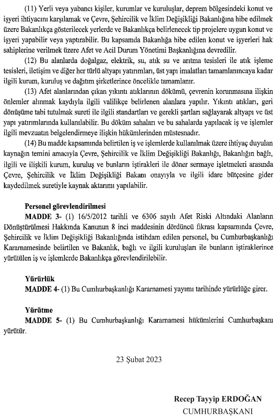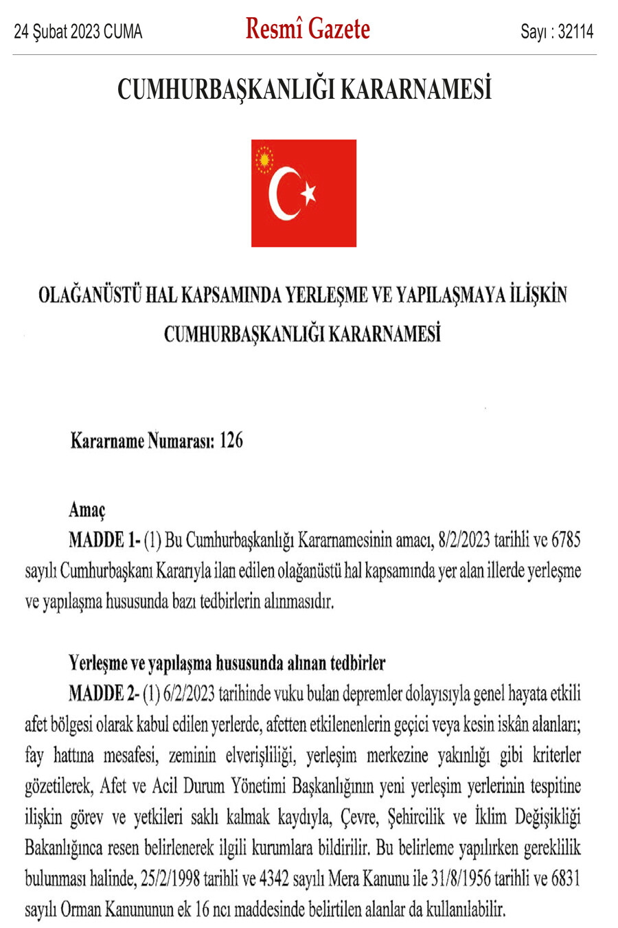 Hükûmet, depremin etkilediği illerde hızlıca yeni konutların yapılabilmesi için bir dizi kriter uygulamaya koydu. Yerleşim ve yapılaşma alanlarını Çevre, Şehircilik ve İklim Değişikliği Bakanlığı resen belirleyebilecek.