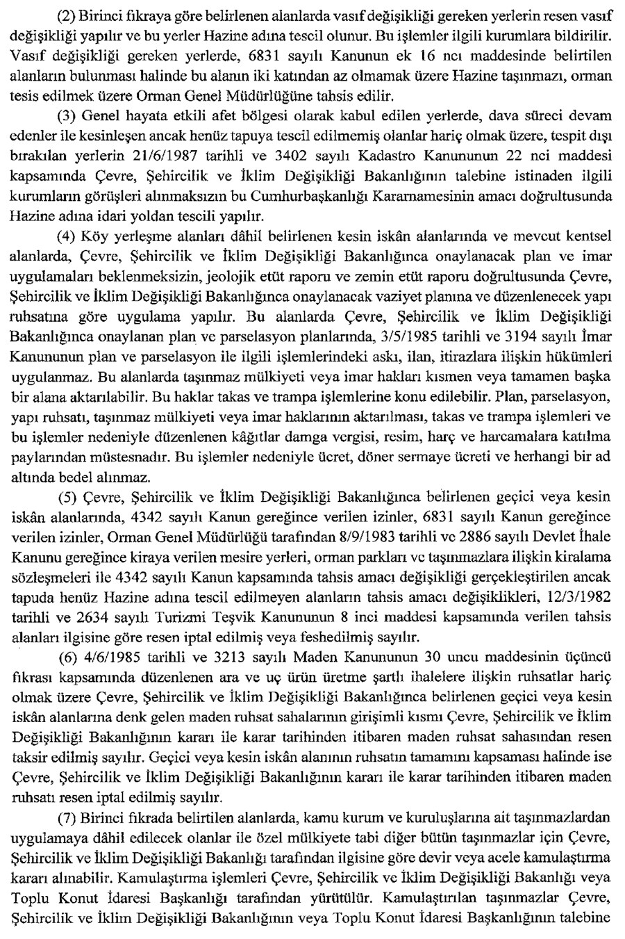 İhtiyaç olması halinde, mera alanları ve orman alanları da kullanılabilecek. Bu durumda, orman vasfı dışına çıkarılan alanların iki katından az olmamak üzere hazine taşınmazı, orman tesis edilmek üzere Orman Genel Müdürlüğüne tahsis edilecek. Köy yerleşme alanları dâhil belirlenen kesin iskân alanlarında ve mevcut kentsel alanlarda, Bakanlıkça onaylanacak plan ve imar uygulamaları beklenmeksizin, jeolojik etüt raporu ve zemin etüt raporu doğrultusunda Çevre, Şehircilik ve İklim Değişikliği Bakanlığınca onaylanacak vaziyet planına ve düzenlenecek yapı ruhsatına göre uygulama yapılacak.
