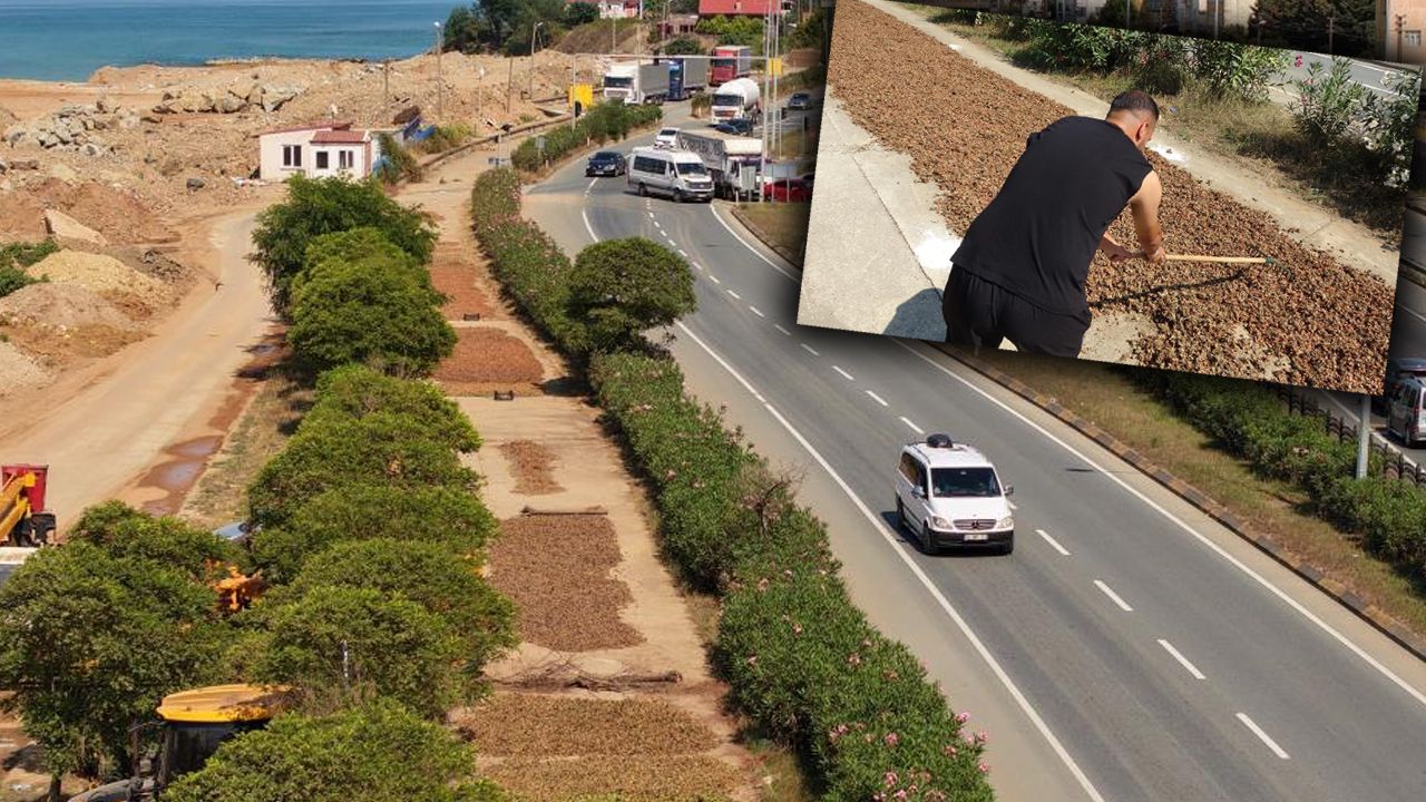 Trabzon'un Arsin ilçesinde fındık bahçesinde çuvallara doldurdukları fındıkları kurutmak için Karadeniz Sahil Yolu'na yoluna kadar getiren üreticiler, fındıkları yol kenarlarında metrelerce uzunluktaki kaldırımlara serdiler. Yüksek kesimlerde uzun süren fındık kurutma işlemi nedeniyle Karadeniz Sahil Yolunu harmana çeviren üreticiler kısa sürede fındıklarını kurutabiliyorlar.