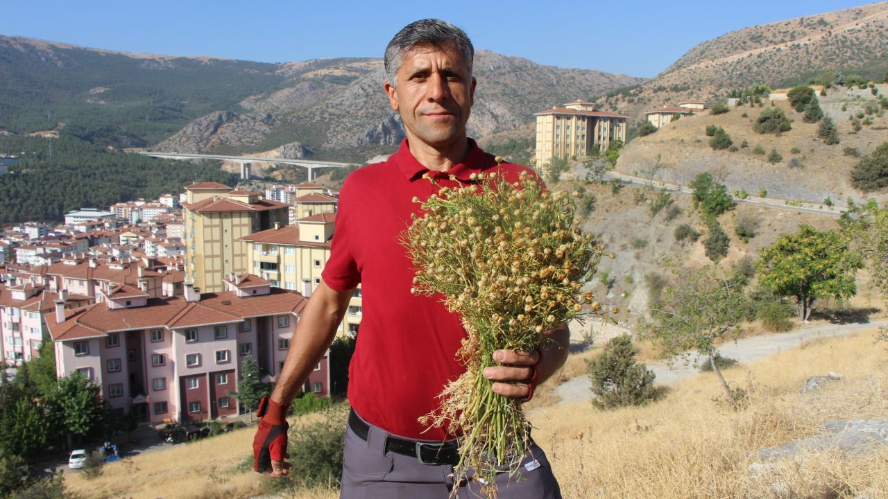 Geleneksel tıpta kullanılan üzerlik otunu hasat etmek için Amasya'nın yüksek kesimlerine sabahın erken saatlerinde çıkan işçi emeklisi Ercan Eftelioğlu, yamaçlardaki kuru otlar arasında üzerlik otlarını tek tek topluyor. Eftelioğlu, topladığı otları buket yaparak 100 TL’den başlayan fiyatlarla satışa sunuyor.