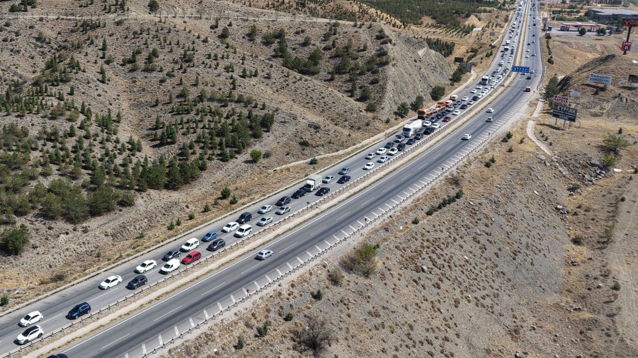 43 ilin geçiş güzergahı Kırıkkale'de, yol yapım çalışmaları nedeniyle trafik felç oldu. Uzun araç kuyruğu havadan görüntülendi.