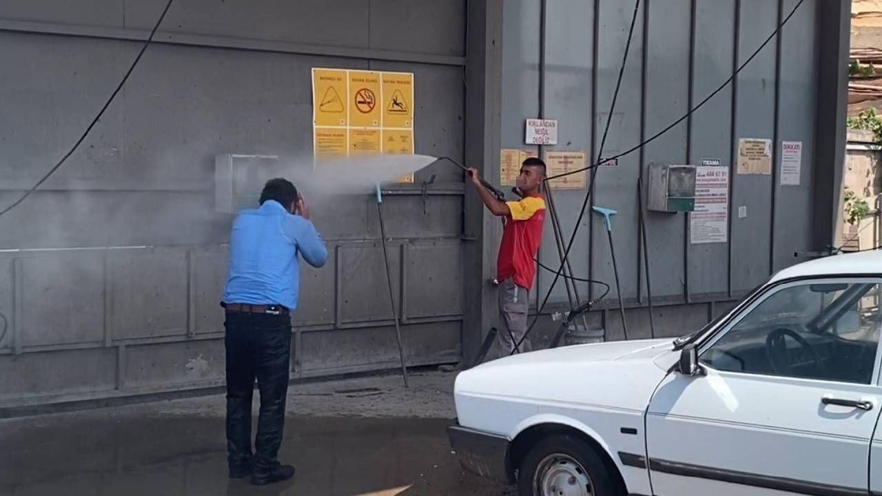 Benzin istasyonundaki çalışan, müşterisinin isteği üzerine tazyikli suyla serinlemesine yardımcı oldu. O anlar çevredeki vatandaşların bakışları arasında gerçekleşti.