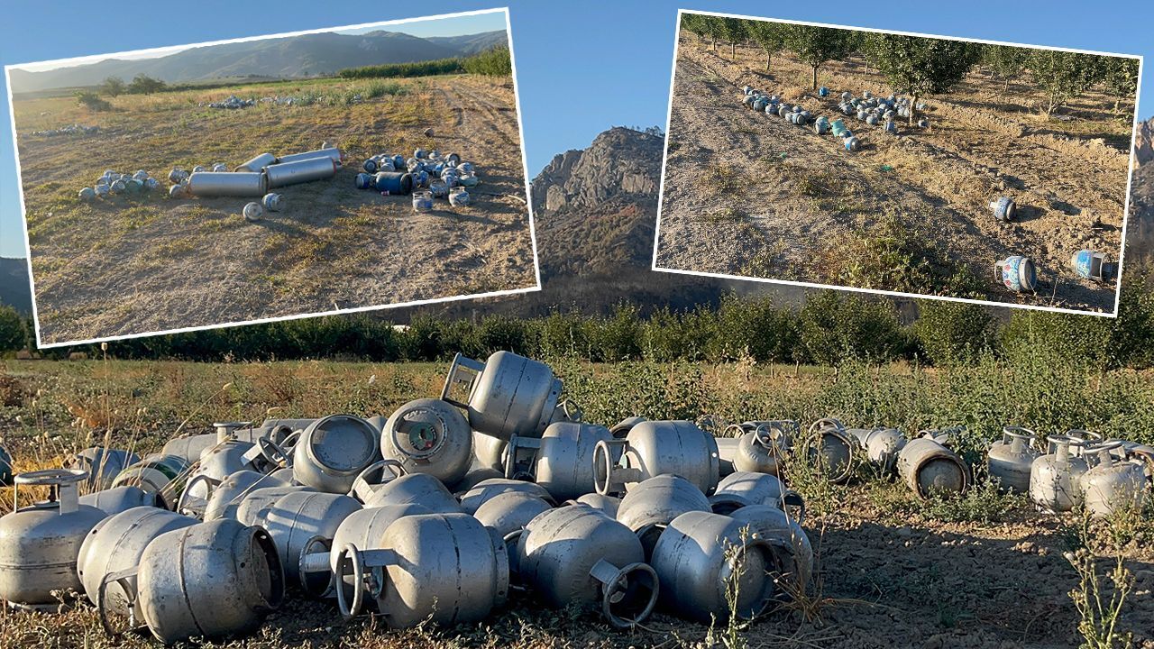 Yangın sonrası alevlerin yaklaşması üzerine boşaltılan Bilecik’in Selçik köyünde, patlama riskine karşı boş bir araziye istiflenen mutfak, piknik ve sanayi tipi onlarca tüp ilginç manzaralar oluşturdu.