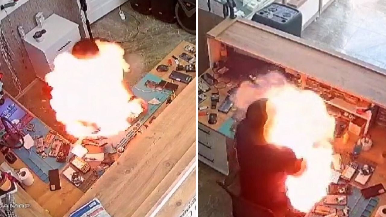 Aksaray'da bir telefon tamircisinin değiştirmeye çalıştığı batarya bomba gibi patladı. Telefon bir anda alev topuna dönerken, tamirci de alevler arasında kaldı. O anlar saniye saniye kameraya yansıdı.
