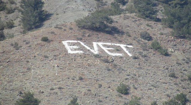Gaziantep'in İslahiye ilçe belediyesinde çalışan işçiler, taş ve kireçle Değirmencik Dağı'na yazdıkları "Evet" ile Anayasa değişikliği referandumuna destek verdi.