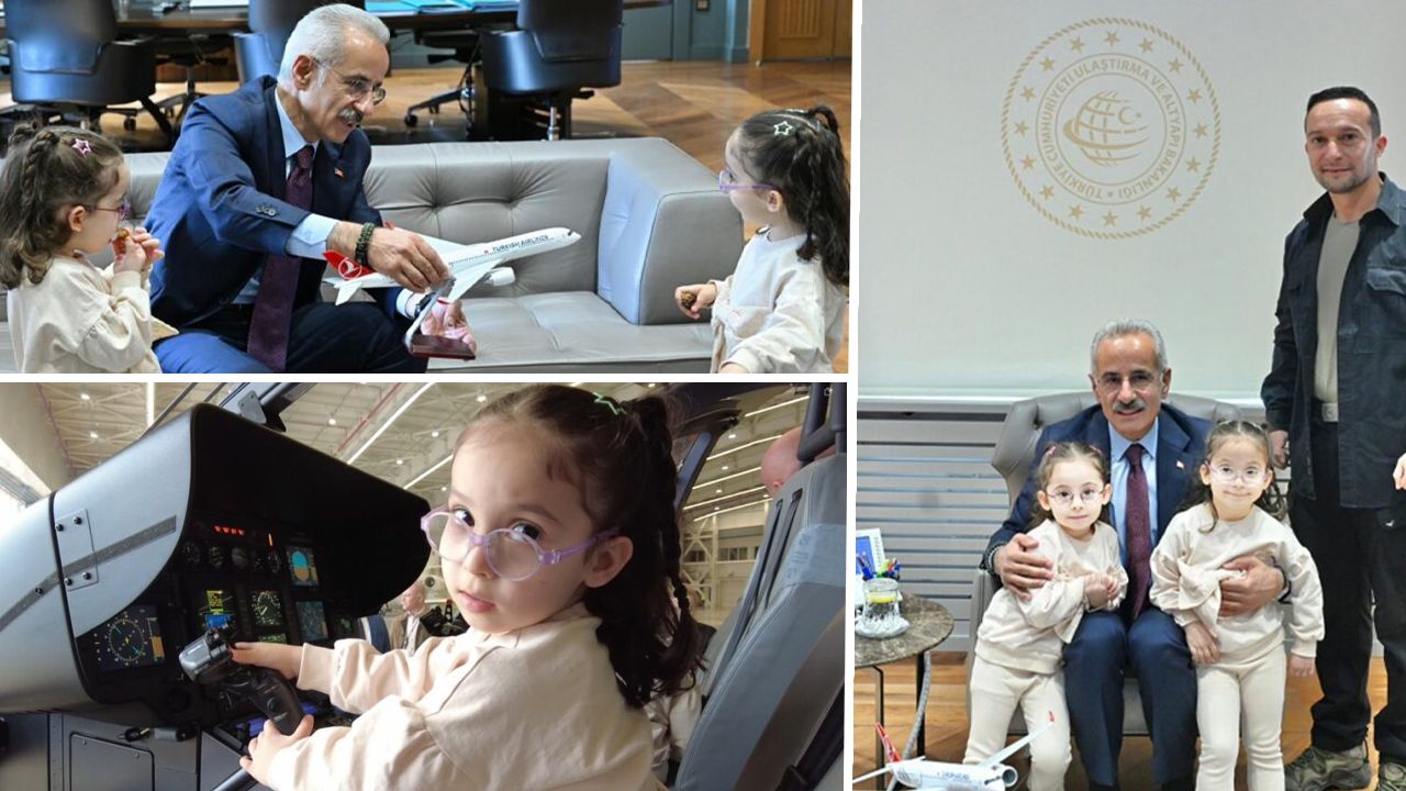 Ulaştırma ve Altyapı Bakanı Uraloğlu, uçaklara duydukları ilgiyle sosyal medyada gündem olan 4,5 yaşındaki ikizler Erva ve Zümra’yı makamında ağırladı. İkizler, hem Bakanlık ziyaretiyle hem de kokpit deneyimiyle hayallerine bir adım daha yaklaştı.