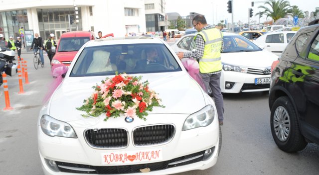 Samsun Emniyet Müdürlüğü Trafik Denetleme Şube Müdürlüğü'nün gerçekleştirdiği sahte plaka denetlemesine polis ekibi, plakası kapalı giden gelin arabasını durdurdu. Gelin arabasını kullanan damat Hakan Sönmez'e 412 TL para cezası kesildi. Polis ekiplerini karşılarında gören damat ve gelin kısa süreli şaşkınlık geçirdi.