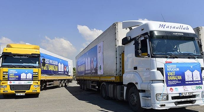 Konuşmanın ardından "Kardeşçe Paylaşım, Vakit Ramazan" pankartlarının asıldığı tırlar konvoy halinde yola çıktı.