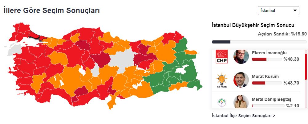 Saat 19:41 itibariyla oyların yüzde 19’u açıldı. Buna göre CHP adayı Ekrem İmamoğlu yüzde 48 önde, AK Parti adayı Murat Kurum yüzde 43 oy oranı ile onu takip ediyor.