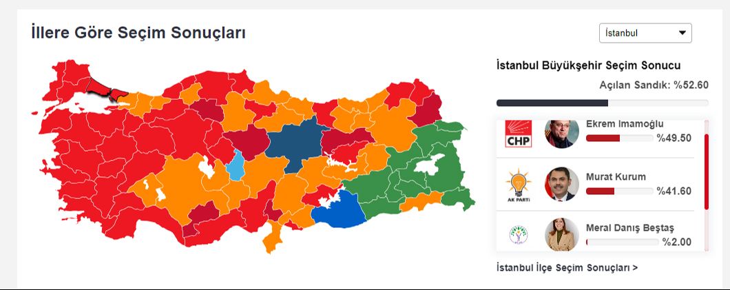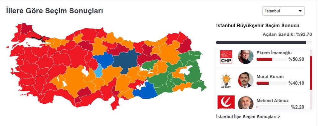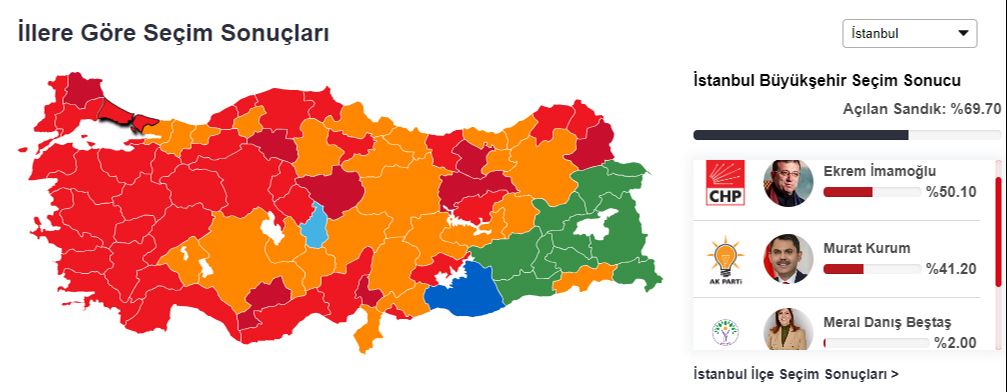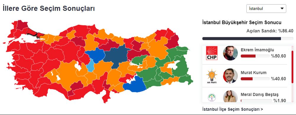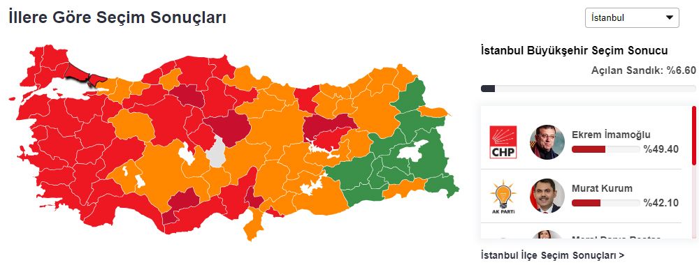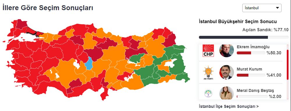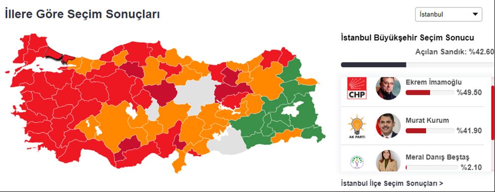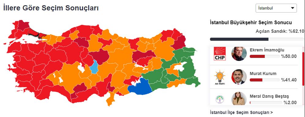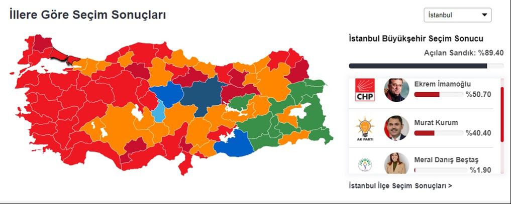 İBB Başkanı Ekrem İmamoğlu, kesin olmayan sonuçlara göre seçimleri kazandıklarını belirtti. İmamoğlu açıklamasında “Yarın kutuplaştırıcı dil bitecek. Sandıklardan coşa coşa demokrasi fışkırdı. Türkiye demokraside yarından itibaren yeni bir dönemi yeşertecek. İstanbul'un tüm çiçekleri yarın doğan güneşle açacak. İstanbul sonuçları dünyaya da verilmiş bir mesajdır. Bu başarı İstanbulluların başarısıdır. Yarın hizmette 'Tam yol ileri' demeye devam edeceğiz. Sayın genel başkanıma, beni bu yolculuğa çıkaran Kemal Kılıçdaroğlu'na ve bize destek veren herkese teşekkür ediyorum” ifadelerini kullandı.