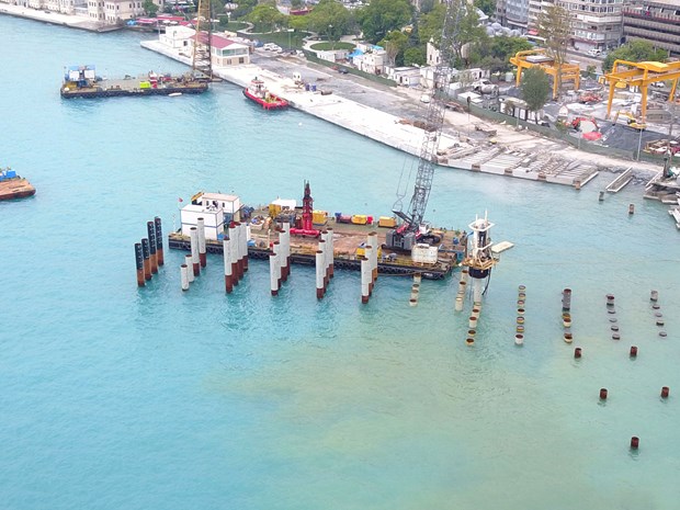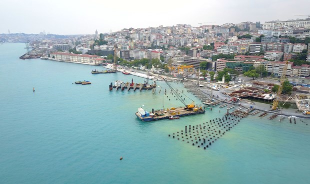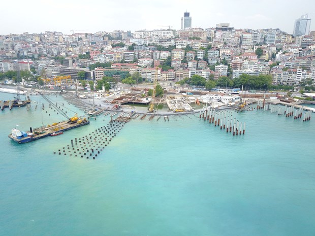 Bu arada kıyıdada kazıklar üzerinde inşa edilen yaklaşık 20 metre eninde, yaklaşık 600 metre uzunluğunda bir alanda yürüme yolu ve sosyal alanlar yapımı çalışması da sürüyor. Bu bölgede İstanbul Boğazı'nın turkuaz rengi ise çalışmalar nedeniyle yer yer çamurlu suyla karışmış durumda gözüküyor.