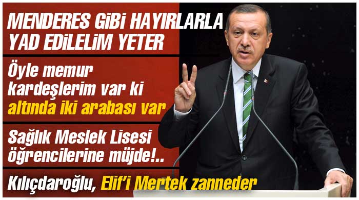 AK Parti Genel Başkanı ve Başbakan Recep Tayyip Erdoğan, AK Parti İl Başkanları Toplantısı'nda önemli mesajlar verdi. Hükümetin icraatlarını anlatan ve geçmiş hükümetlerle kendi dönemlerini karşılaştıran Erdoğan, "Millete hizmetkârlık bizim aşkla, sevda ile yoğrulduğumuz içine samimiyetimizi kattığımız büyük bir mesuliyettir, 'En hayırlınız, hizmet edenleriniz'; bizim yolumuzun ışığı ve rehberi budur. Milletimiz de bizim bu noktada ki samimiyetimizi görmüş ve her dönemde bize desteğini arttırmıştır. Biz bütün gayretlerimizin, aşkımızın ve sevdamızın karşılığını gerçekten fazlasıyla aldık. Sadece seçimlerde değil ortaya koyduğumuz eserlerle de farkımızı ortaya koyduk" dedi.MENDERES GİBİ HAYIRLA YAD EDİLELİM YETER
