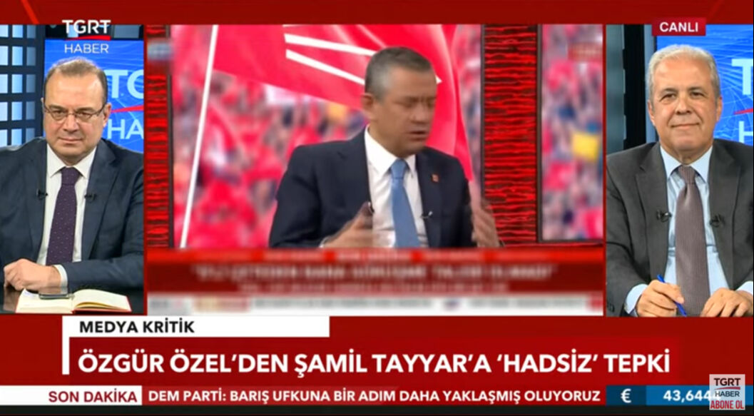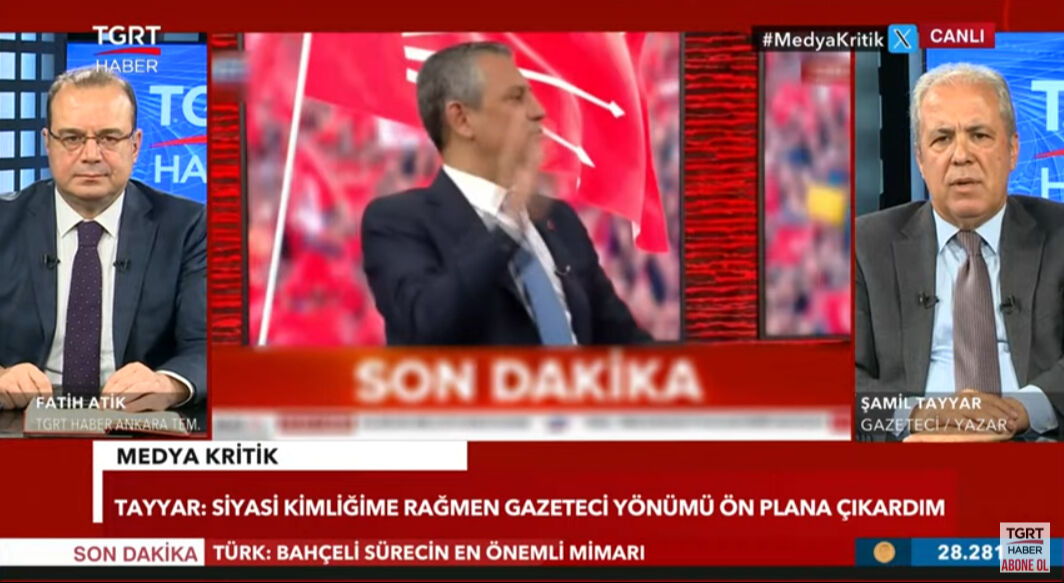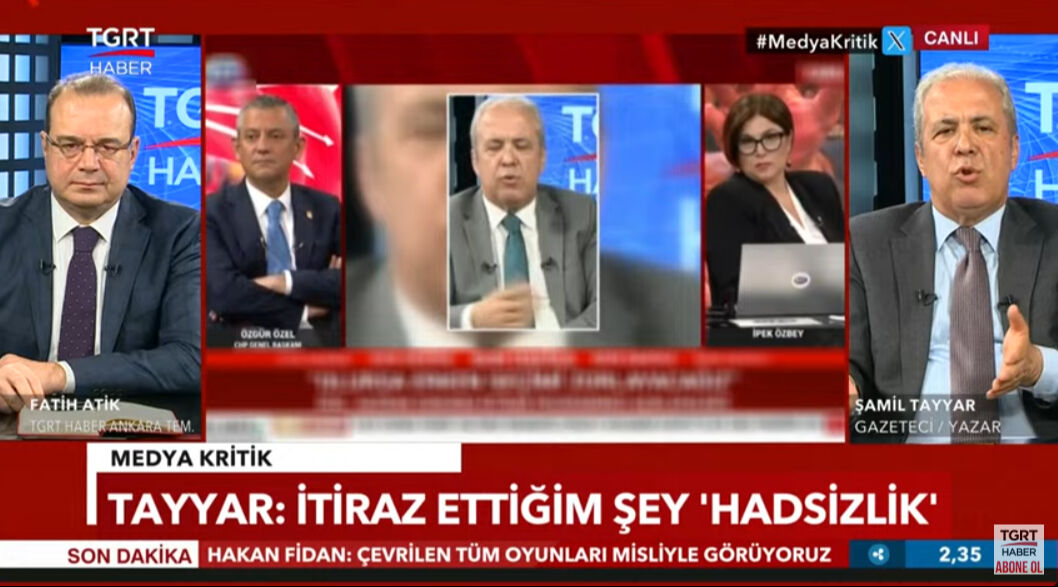 TGRT Haber'de yayımlanan Medya Kritik programına katılan Şamil Tayyar, Özgür Özel'in bir televizyon programında kendisini hedef aldığı açıklamalarına cevap verdi. Programın sunucusu Tuna Öztunç da Özel'in 'Bu cevabı TGRT yayınlayamaz' sözlerine "Yayınladık sayın Özel. Bakın yayınladık' dedi.