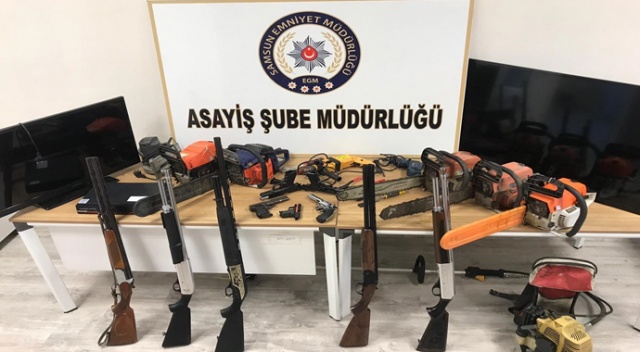 Samsun Emniyet Müdürlüğü Asayiş Şube Müdürlüğü Hırsızlık Bürosu ekiplerinin takibi sonucu yakalanan şüphelilerin toplam değeri yaklaşık 70 bin lira olan silah, fındık, ceviz, su motoru, dinamo, hızar testere, mazot, kablo, av tüfeği, bisiklet, akü, içki, bakır mutfak gereçleri, LCD TV ve sigara çaldıkları ortaya çıktı. Polis olayla ilgili Y.E.I., O.Y., A.F.B. ve M.Ş.'yi Samsun il merkezinde, V.A., Ö.D., C.K., S.A., E.Y., A.C.D. ve O. K.'yi ise Çarşamba ilçesinde yakalayarak gözaltına aldı. Gözaltına alınan şahıslarla birlikte 6 adet av tüfeği, 5 adet kurusıkı tabanca, 6 adet ağaç kesme motoru, 2 adet ot biçme motoru, 2 adet matkap, 1 adet spiral, 1 adet ruhsatsız tabanca, 5 adet LCD TV, 2 adet keski, 2 adet tornavida, 1 adet kerpeten ve 3 adet eldiven ele geçirildi. 4 adet televizyon, 1 adet av tüfeği ve 1 adet ot biçme motoru ise müştekileri tespit edilerek teslim edildi.