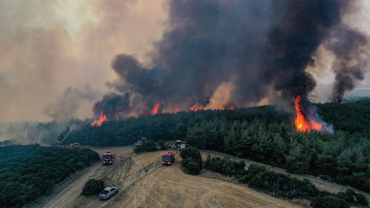 Rüzgarın etkisiyle geniş alana yayılarak Çanakkale sınırını geçen yangına havadan 15 uçak, 19 helikopter, 76 arazöz, 4 iş makinesi, 509 personelle müdahale ediliyor.
