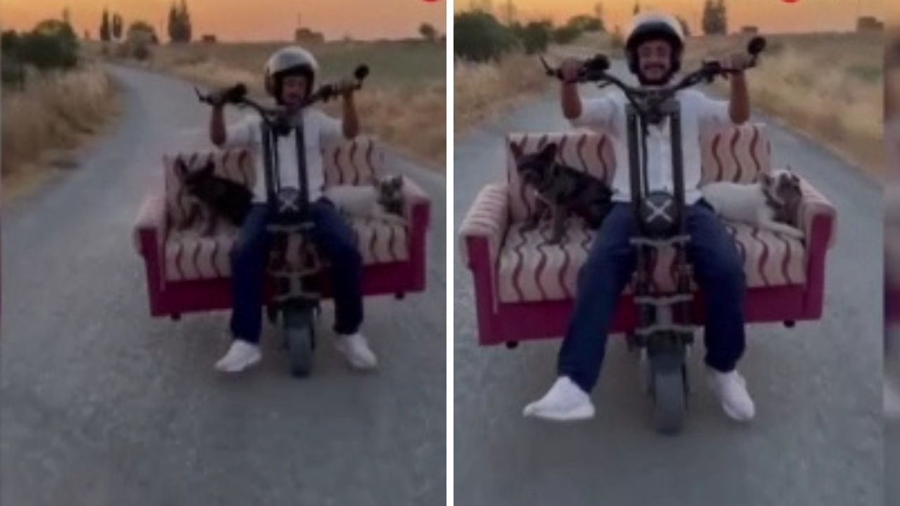 Muğla'da geçtiğimiz yıl koltuk monte ettiği Scooterla kara yolunda ceza alan Oğuzhan Bostan (28), bu kez elektrikli Scooter üzerine çift kişilik koltuk monte ederek köpekleriyle birlikte yolculuk yaptı.
