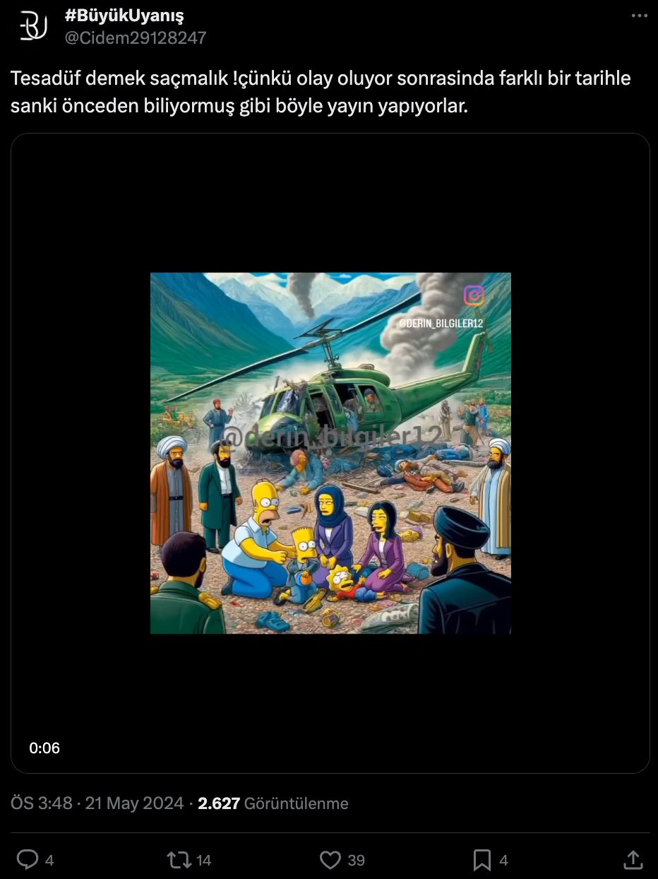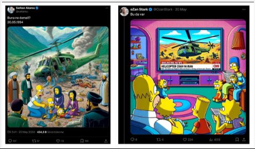 Sosyal medya uygulaması X'te (eski adıyla Twitter) animasyon televizyon komedisi olan "The Simpson" dizisinin geçmiş bölümlerinde İran'da gerçekleşen helikopter kazasının işlendiği iddia edildi.