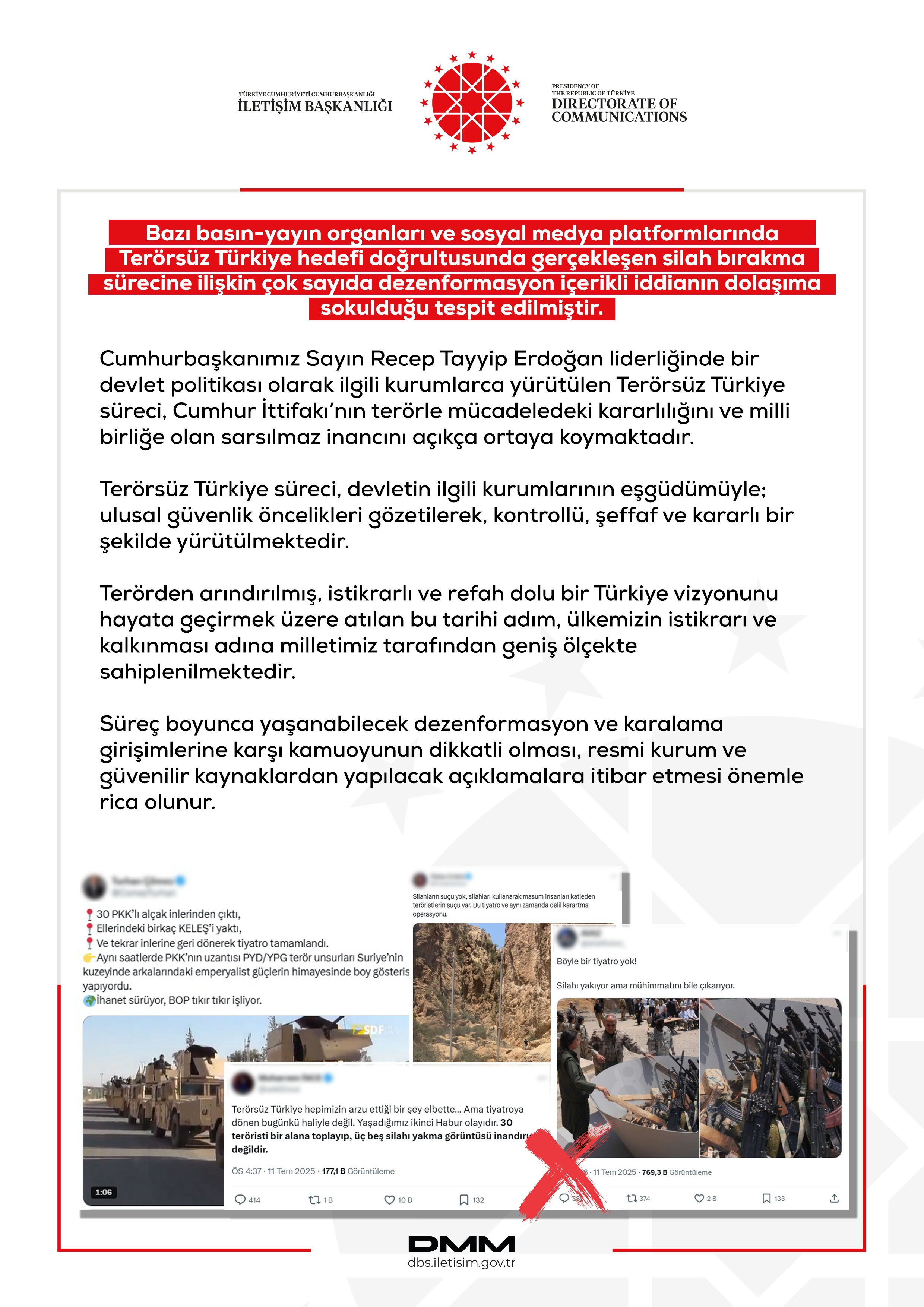 DMM'den yapılan açıklamada, bazı basın-yayın organları ve sosyal medya platformlarında "Terörsüz Türkiye" hedefi doğrultusunda gerçekleşen silah bırakma sürecine ilişkin çok sayıda dezenformasyon içerikli iddianın dolaşıma sokulduğunun tespit edildiği belirtildi.