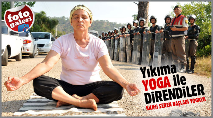 Yıkımın yapılacağı işletmelerden birinin önünde toplanan sivil toplum kuruluşlarının temsilcileri ve diğer vatandaşlardan oluşan grup, yola kilim sererek yoga yapmaya başladı.