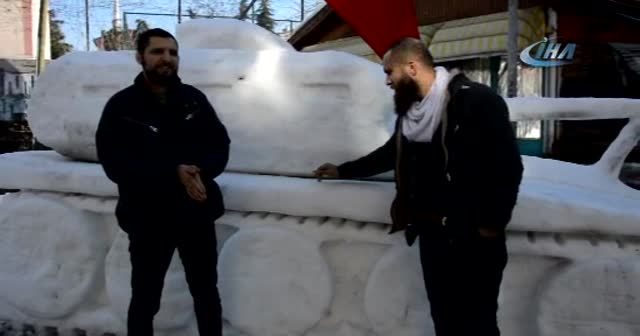 Tokat’ın Niksar ilçesinde iki kardeş, 4 ton kar kullanarak orijinal boyutlarda 'kardan tank' yaptı.