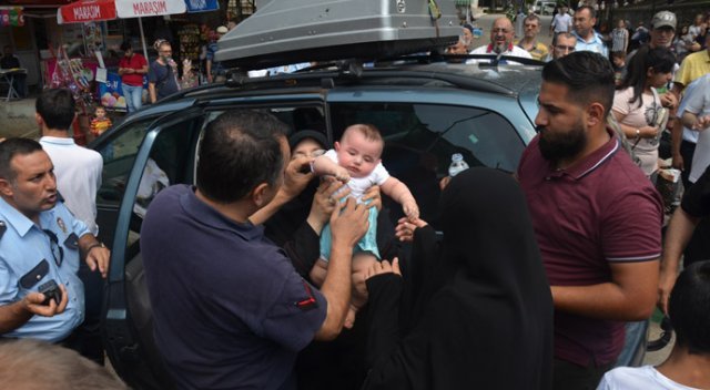 Almanya'dan tatil için Bursa'ya gelerek tarihi yerleri gezen aile Yeşil Türbe önündeki otoparkta araçlarından indikten sonra kapılar kilitlendi. Araç içerisinde kalan 5 aylık bebek için seferber olan çevredekilerin "camı kıralım" önerisine kulak asmayan baba çilingir bekledi. Talihsiz bebek yarım saat sonra sıcaktan bitkin düşmüş şekilde kurtarıldı.