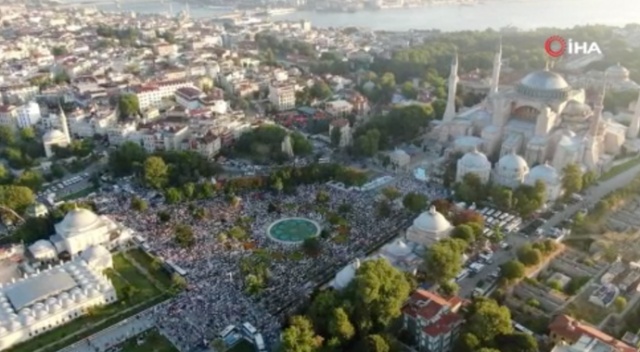 Ayasofya-i Kebir Camii Şerifi'nde bayram namazı coşkusu drone ile görüntülendi. 86 yıl sonra kılınan ilk bayram namazında binlerce vatandaşın saf tutuğu görüldü. Ayasofya-i Kebir Camii Şerifi'nde bayram coşkusu yaşandı. Binlerce vatandaş Ayasofya önündeki alanda saf tuttu. Ayasofya'da 86 yıl sonra kılınan ilk bayram namazı drone ile havadan da görüntülendi. Binlerce vatandaşın meydanda sosyal mesafe kurallarına uyarak kıldığı namaz, eşsiz görüntüler oluşturdu.