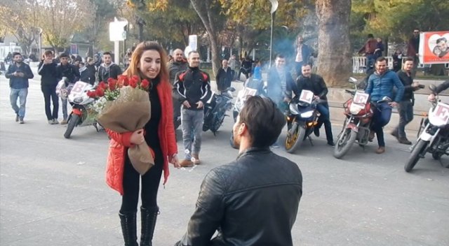 Kocaeli’de yaklaşık 30 motorcu, arkadaşlarının evlilik teklifi için bir araya geldi. Motor üstünde alana gelen genç kız, sürpriz evlilik teklifi karşısında adeta şoka girdi.