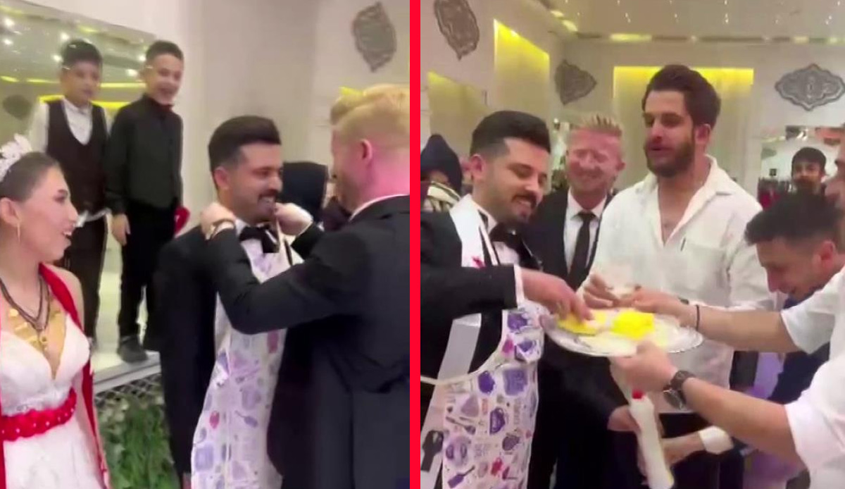 Kahramanmaraş’ta bir düğünde takı merasiminde damada arkadaşları tarafından mutfak önlüğü giydirildikten sonra bulaşık yıkatıldı. Davetliler bu şaka karşısında kahkahaya boğuldu.