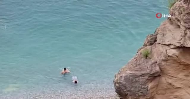 Antalya’da iki gencin ölüm oyunu kameralara yansıdı. Konyaaltı sahilinde elleri ve ayaklarına arkadaşı tarafından plastik kelepçe takılan genç, kayalıklardan atlayıp kıyıya kadar yüzdü.