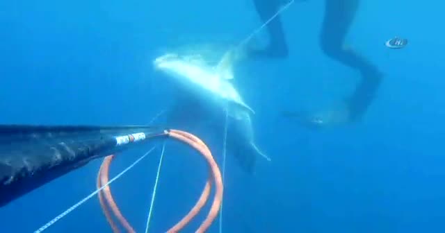 Çanakkale’de zıpkınla dalış yapan bir kişi, 150 santimetre uzunluğunda ve 50 kilogram ağırlığında akya türü balık yakaladı.