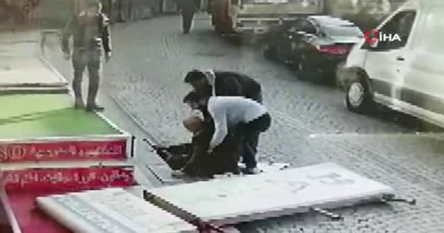 İstanbul Fatih’te kaldırım kenarına oturarak dinlenmek isteyen yaşlı adamın üzerine reklam panosu düştü. O anlar güvenlik kameraları tarafından kaydedildi.