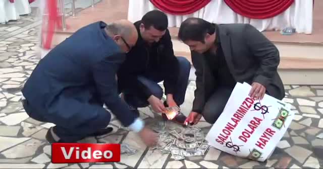 Cumhurbaşkanı Recep Tayyip Erdoğan'ın 'Dolarlarınızı bozdurun, altına ve Türk Lirası'na çevirin' çağrısına vatandaş desteği sürüyor. Mersin'in Erdemli ilçesinde düğün salonu sahipleri düğünlerde artık dolarla jest yapılmasını istemiyor. Salon sahipleri ne sahtesinin ne de gerçeğinin salonlarında kullanılmasına izin vermeyeceklerine dair yaptıkları açıklama sonrası, salonda sahte 1 dolar banknotları yaktılar.