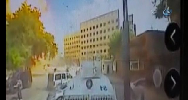 Gaziantep Emniyet Müdürlüğü önünde patlama meydana geldi. Bir polisin şehit olduğu, 9'u polis 13 kişinin yaralandığı bombalı saldırının patlama anı güvenlik kameralarına böyle yansıdı.