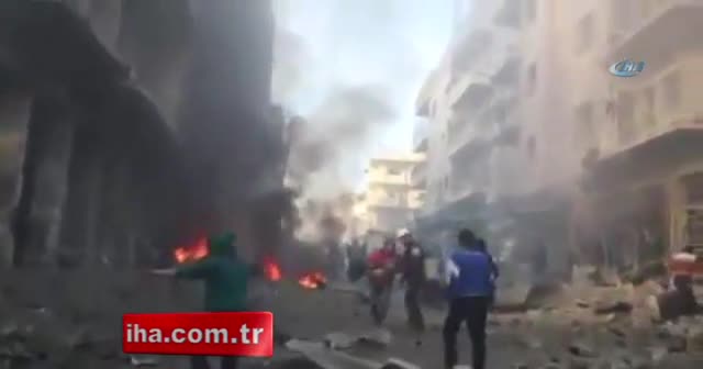 Suriye'nin Halep şehrine rejim uçakları tarafından yapılan hava saldırısı sonrası yaşanan korkunç görüntüler kameralara böyle yansıdı.