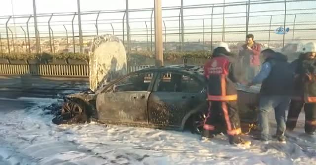 Haliç Köprüsü'nde Ankara istikametinde seyir halinde bir otomobil yandı. Olay yerine itfaiye ekipleri sevk edilirken, trafik tamamen durdu. Metrobüs seferlerinin de çift yönlü olarak yapılamadığı öğrenildi.