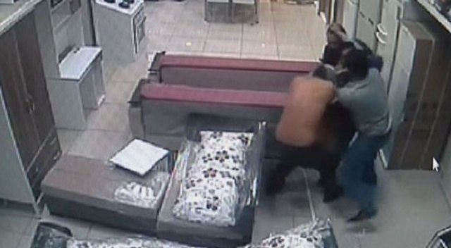 İzmir'in Buca ilçesinde haraç almak için mobilyacıya geldiği iddia edilen iki kişi, işyeri sahiplerinden dayak yedi. Şahıslardan biri baygınlık geçirirken diğeri 3 bin 700 lira ve altın kolyeyi çalıp kaçtı.